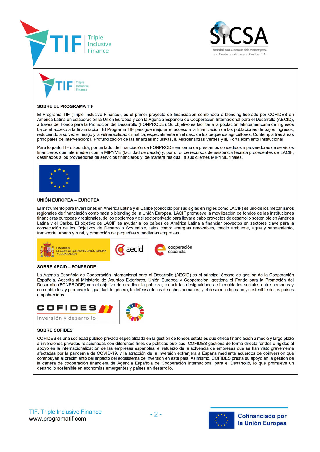 Este contrato se sufraga a través del Programa Triple Bottom Line Inclusive Finance in Latin America. Promoting Climate Smart Finance & Better Access o, abreviadamente, “Triple Inclusive Finance” (en adelante «TIF»), financiado con una contribución de la Unión Europea, formalizada entre COFIDES y SICSA. El contrato está, a su vez, cofinanciado por SICSA.